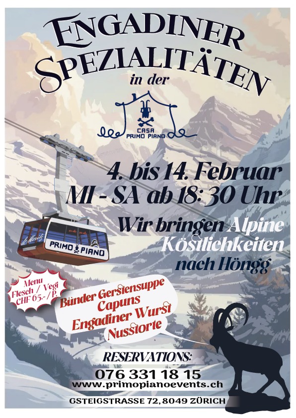 Vermisst Du die Berge und die alpine Küche? Wir bringen den Alpenflair nach Höngg! Besuche uns in unserem wunderbaren Bauern-Haus am Hönggerberg, in der Casa Primo Piano an der Gsteigstrasse 72. Wir servieren vom 4. bis am 14. Februar alpine Köstlichkeiten aus dem Engadin von Mittwoch – Samtsag ab 18:30 Uhr.